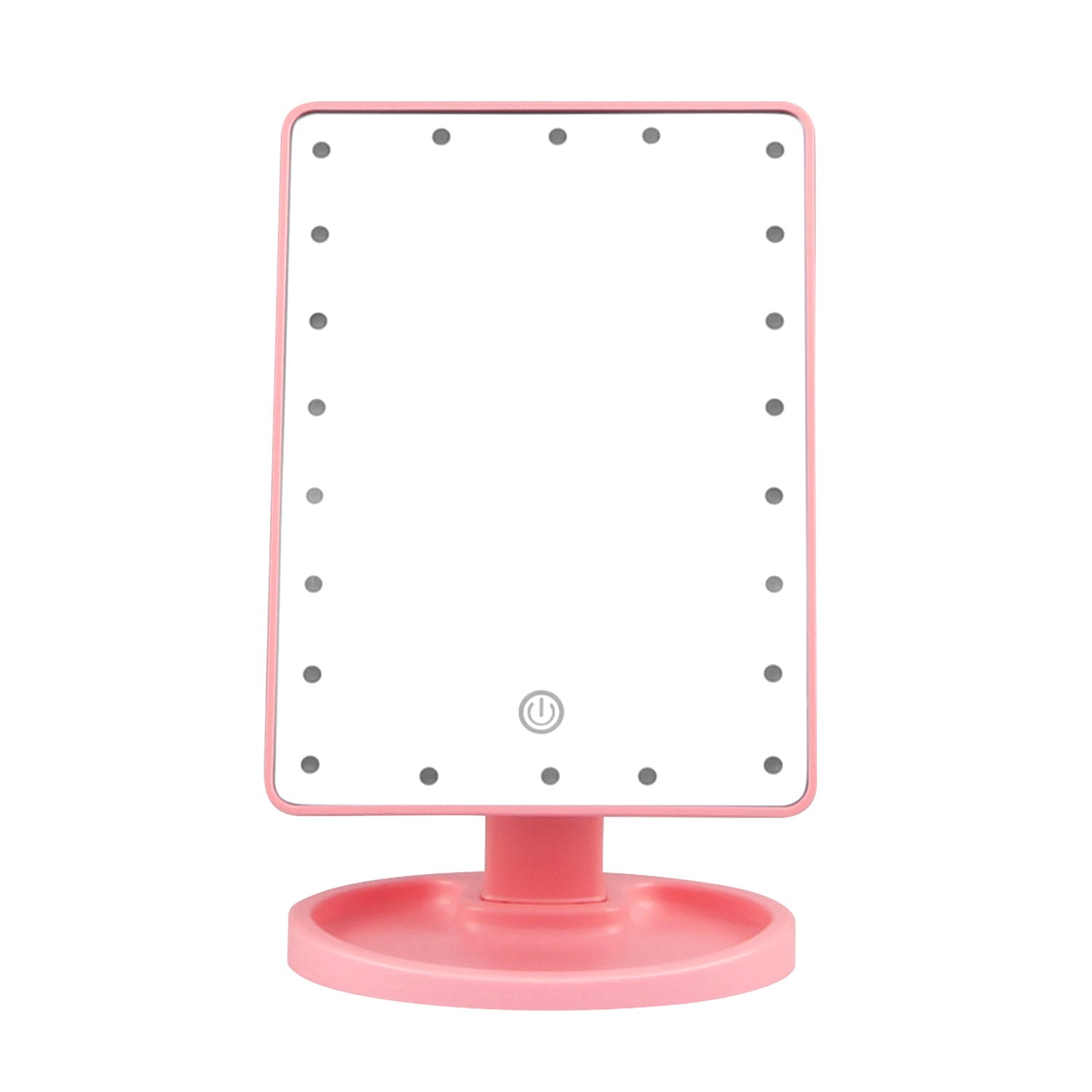 This large cosmetic mirror with 22 bright LEDs allow you to pluck eye brows or put on your make-up in the dark or poorly lit areas. You can put it on your desk and adjust the mirror to your desired positions. The touch screen is nice for you to turn on/off the LED spotlights and adjust the brightness to your preference. Soft bright lights can be operated by USB charging cable (included) or 4pc AA batteries (not included).